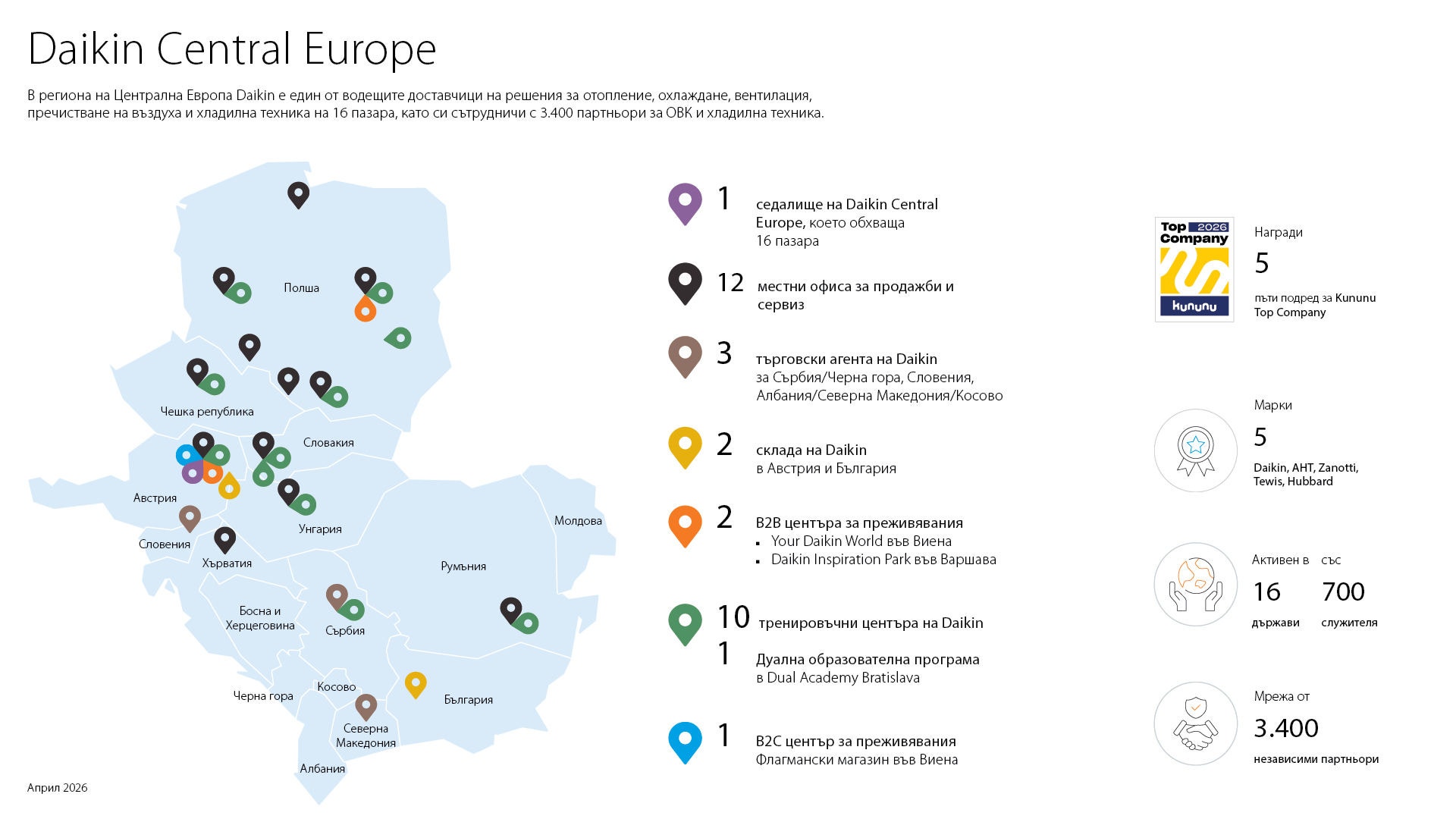 - Локации на Daikin в региона EMEA и CE: производствени бази за HVAC-R, центрове за научноизследователска и развойна дейност, центрове за обучение B2B, центрове за преживявания B2C