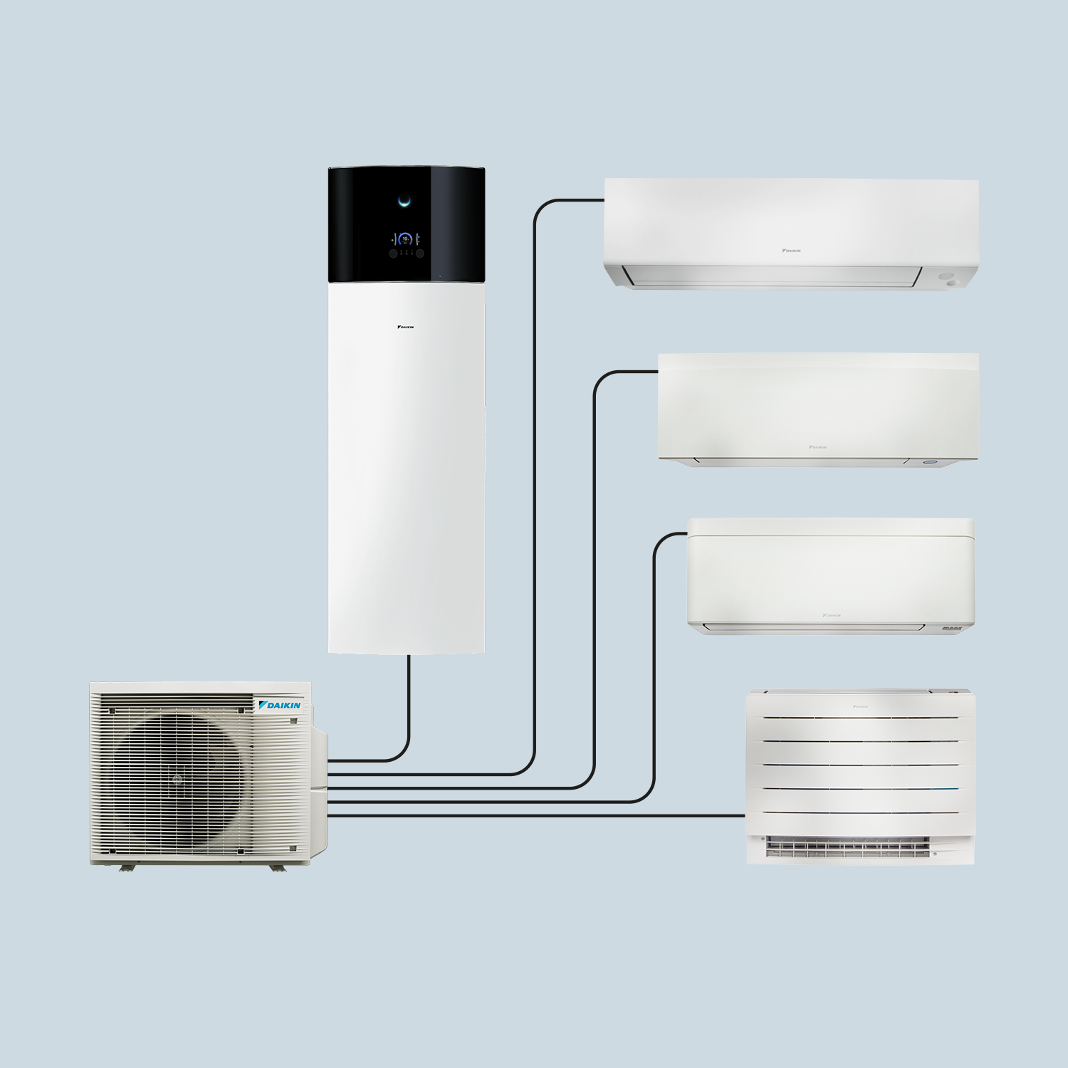 Отоплявайте и охлаждайте дома си и генерирайте гореща вода, като свържете едно външно тяло с до четири вътрешни тела и бойлер за гореща вода
